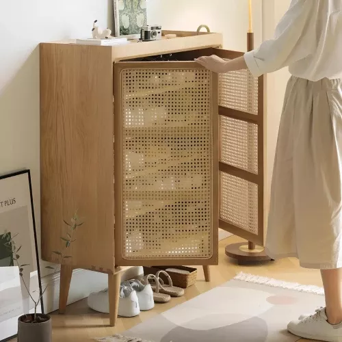 What makes this shoe cabinet special is its unique combination of traditional rattan craft with modern white oak woodwork. This blend not only ensures durability but also adds a touch of elegance to your home decor. The user-friendly design with easy access and substantial storage space makes it an essential piece for any home.